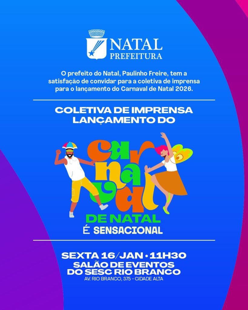 O prefeito de Natal, Paulinho Freire, convida a imprensa para a coletiva de lançamento oficial do Carnaval de Natal 2026, que acontecerá nesta sexta-feira (16), às 11h30, no Salão de Eventos do Sesc Rio Branco, localizado na Cidade Alta.